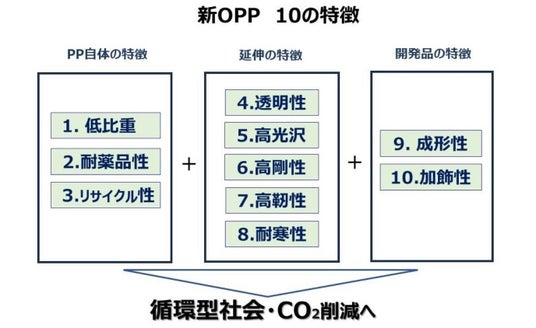 一般的に2軸延伸ポリプロピレンフィルムは、主に食品用軟包装資材用途として厚さ30ミクロンから50ミクロンで使用されております。今回当社が開発した新OPPシートは、150ミクロンから300ミクロンであり、2軸延伸ポリプロピレンフィルムの5倍から6倍の厚さとなります。この新OPPシートは、食品容器用シートとして、優れた透明性、耐熱性、耐寒性や耐油性のみならず、極低温から高温まで幅広い温度域における剛性と耐衝撃性の高い物性バランスを発現しています。