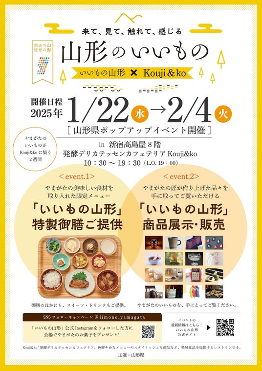 山形県は、山形県産品ブランドプロモーションの一環として、やまがたの匠が細部にまでこだわり仕上げた品々に触れ、購入できる情報発信イベント《1.:山形県ポップアップイベント「いいもの山形×Kouji&ko ~来て、見て、触れて、感じる山形のいいもの~」》を、2025年1月22日(水)~2025年2月4日(火)の14日間、新宿高島屋8階の発酵デリカテッセンカフェテリア「Kouji&ko」にて開催いたします。本イベントでは、工芸品・手仕事品を中心とした山形県産品を実際に手に取り、購入できるほか、県産食材・加工食品を使用した限定メニューの提供等山形県と山形のものづくりに触れる・味わうことができるイベントとなっております。