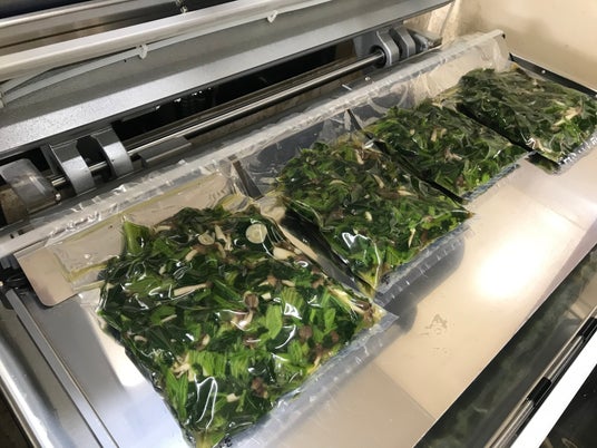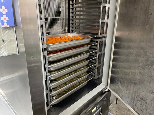 スチームコンベクションオーブンで調理したものをブラストチラーで急速冷却し真空パックにします。