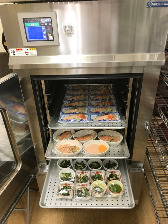 施設でのお食事提供(先に盛り付けをし、その後は食器もあわせての加熱ですので衛生的です)