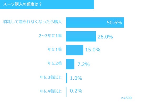 スーツの購入頻度について最も多くの回答を集めたのは「消耗して着られなくなったら購入」で、全体の50.6%を占めました。