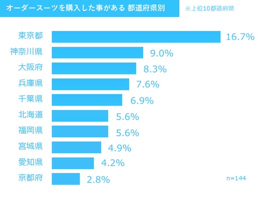 オーダースーツを購入したことがある人の割合を都道府県別に見ると、最も割合が高かったのは東京都で16.7%でした。次いで、神奈川県が9.0%、大阪府が8.3%と、都市部が上位を占める結果となりました。