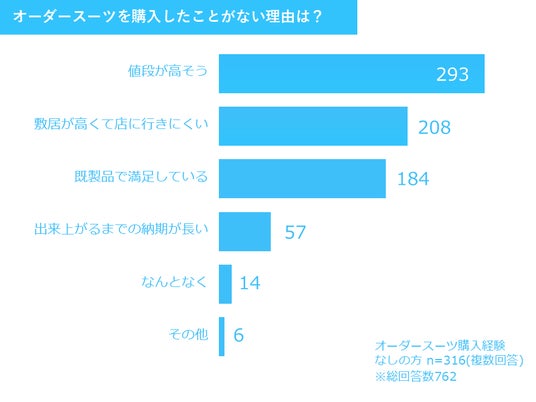 オーダースーツを購入したことがない理由として最も多かったのは、「値段が高そう」で293件でした。