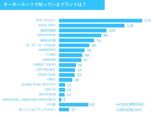 知名度の高いオーダースーツブランドとして「SUIT SELECT」が175件で最も多くの回答を集め、1位となりました。