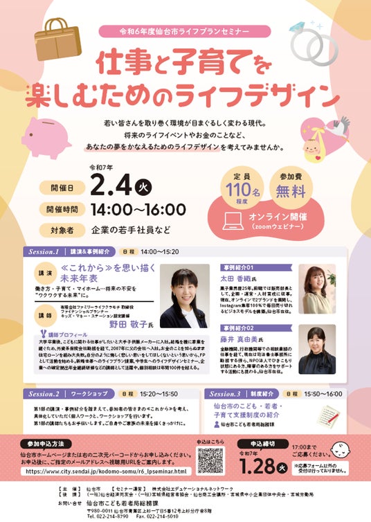 仙台市では、「仕事と子育てを楽しむためのライフデザイン」をテーマに、ライフプランセミナーを開催します。