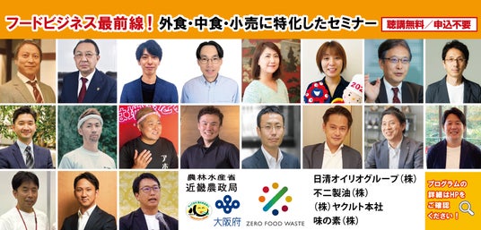 近畿農政局/近畿経済産業局/大阪労働局/大阪府/大阪市/阪南市/京都府/兵庫県/奈良県/和歌山県/滋賀県/公益財団法人大阪観光局/大阪商工会議所/大阪府商工会議所連合会/関西広域連合/全国商工会連合会/大阪府商工会連合会/京都府商工会連合会/兵庫県商工会連合会/奈良県商工会連合会/和歌山県商工会連合会/滋賀県商工会連合会/日本商工会議所/京都府商工会議所連合会/兵庫県商工会議所連合会/奈良県商工会議所連合会/和歌山県商工会議所連合会/滋賀県商工会議所連合会/三重県商工会議所連合会/京都商工会議所/神戸商工会議所/全国中小企業団体中央会/奈良県中小企業団体中央会/和歌山県中小企業団体中央会/滋賀県中小企業団体中央会/三重県中小企業団体中央会/日本貿易振興機構(ジェトロ)大阪本部/公益社団法人2025年日本国際博覧会協会/公益社団法人日本給食サービス協会/公益社団法人大阪府栄養士会/一般社団法人全日本司厨士協会/一般社団法人全日本・食学会/一般社団法人日本惣菜協会/一般社団法人日本厨房工業会/一般社団法人日本飲食団体連合会/一般社団法人大日本水産会/一般社団法人日本パン工業会/一般社団法人日本百貨店協会/一般社団法人日本フードビジネス国際化協会/一般社団法人日本弁当サービス協会/一般社団法人日本洋菓子協会連合会/一般社団法人レストランテック協会/製粉協会/日本マーガリン工業会/NPO法人 居酒屋甲子園/NPO法人 繁盛店への道/一般社団法人Miyabi Partners/一般社団法人日本運搬車両機器協会/一般社団法人日本外食品流通協会/一般社団法人日本ジビエ振興協会/一般社団法人日本3PL協会/一般社団法人日本物流システム機器協会/全国水産加工業協同組合連合会/一般社団法人夢洲新産業・都市創造機構