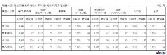 職種大分類別の平均時給は、「専門・技術職」1,447円(前年同月比71円減)、「製造関連・ドライバー職」1,259円(同43円増)、「清掃・メンテナンス職」1,229円(同46円増)、「事務職」1,222円(同52円増)、「飲食サービス職」1,198円(同84円増)、「販売・接客サービス職」1,197円(同63円増)の順で、前年同月比でプラスが5職種、マイナスが1職種となった。