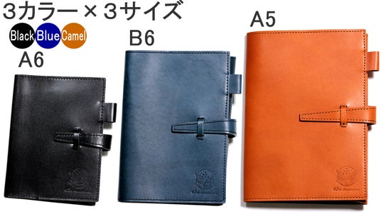 A6、B6、A5の3サイズ×ブラック、ブルー、キャメルの3カラーからご選択!