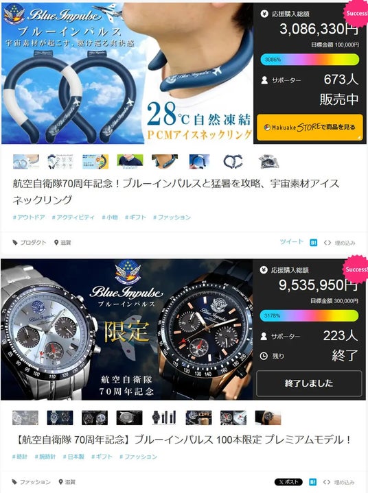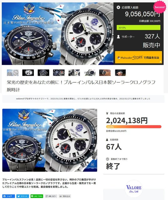 過去に行った弊社のMakuakeとCAMPFIREのプロジェクトでは、合計2300万円を超える金額を集め、大成功を納めた人気のブルーインパルス。合計のサポーター数も延べ1300人に迫る勢いで人気の高さが伺えます。特に弊社では普段使いできるブルーインパルスウォッチを企画した点も多くの指示を集める要因になっています。現在Makuakeにて開催中の別のプロジェクトもパイロットウォッチが約500万円、キーホルダーが17万円、延べ232人のサポーター様からご支援をいただいております。