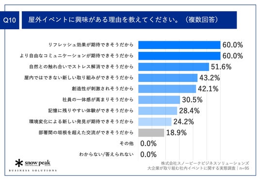 Q9で「非常に興味がある」「やや興味がある」と回答した方に、「Q10.屋外イベントに興味がある理由を教えてください。(複数回答)」(n=95)と質問したところ、「リフレッシュ効果が期待できそうだから」が60.0%、「より自由なコミュニケーションが期待できそうだから」が60.0%、「自然との触れ合いでストレス解消できそうだから」が51.6%という回答となりました。