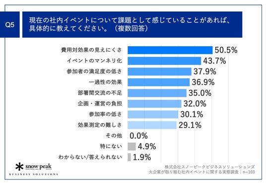 「Q5.現在の社内イベントについて課題として感じていることがあれば、具体的に教えてください。(複数回答)」(n=103)と質問したところ、「費用対効果の見えにくさ」が50.5%、「イベントのマンネリ化」が43.7%、「参加者の満足度の低さ」が37.9%という回答となりました。