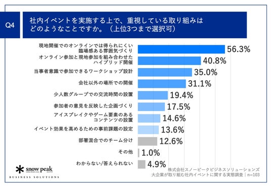 「Q4.社内イベントを実施する上で、重視している取り組みはどのようなことですか。(上位3つまで選択可)」(n=103)と質問したところ、「現地開催でのオンラインでは得られにくい臨場感ある雰囲気づくり」が56.3%、「オンライン参加と現地参加を組み合わせたハイブリッド開催」が40.8%、「当事者意識で参加できるワークショップ設計」が35.0%という回答となりました。