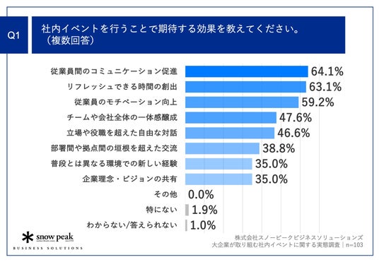 「Q1.社内イベントを行うことで期待する効果を教えてください。(複数回答)」(n=103)と質問したところ、「従業員間のコミュニケーション促進」が64.1%、「リフレッシュできる時間の創出」が63.1%、「従業員のモチベーション向上」が59.2%という回答となりました。