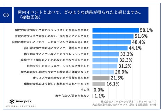 Q7で「ある」と回答した方に、「Q8.屋内イベントと比べて、どのような効果が得られたと感じますか。(複数回答)」(n=93)と質問したところ、「開放的な空間ならではのリラックスした会話が生まれた」が58.1%、「普段のオフィスでは見られない一面を見ることができた」が51.6%、「自然の中だからこそのチームビルディング効果が得られた」が48.4%という回答となりました。