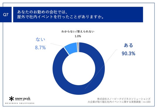 「Q7.あなたのお勤めの会社では、屋外で社内イベントを行ったことがありますか。」(n=103)と質問したところ、「ある」が90.3%、「ない」が8.7%という回答となりました。