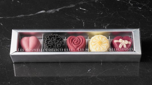 ひとつひとつ手作りの、かわいいハート型や吉祥文様の中には、バレンタインならではの生チョコやトリュフを詰めました。