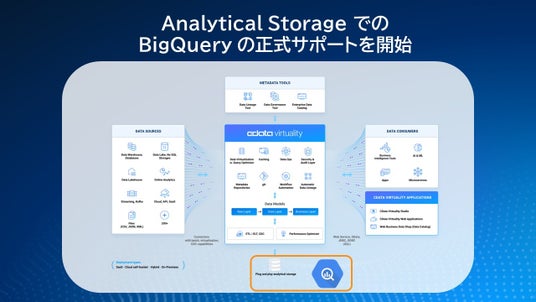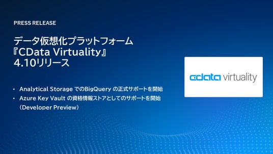 CData Software Japan 合同会社(本社:アメリカノースカロライナ州、日本オフィス:宮城県仙台市、代表社員 職務執行者:疋田 圭介、以下CData)は、データ仮想化プラットフォーム『CData Virtuality』の4.10 アップデートを公開しました。今回のアップデートではAnalytical Storage でのBigQuery の利用を正式にサポートしました。そのほか、Azure Key Vault の資格情報ストアとしてのサポート(Developer Preview)を開始しました。