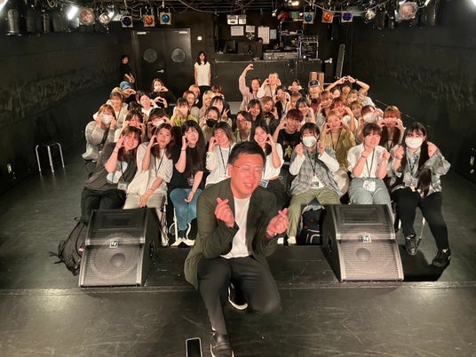 販売会スタッフをしたK-POPビジネスコース1年生と一緒にポーズをとる古家氏