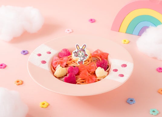 メニューは、ベリエちゃんの可愛いピンク色のパスタ、インパクト大のミントくんのお顔のご飯とスクランブルエッグを添えたホワイトソースのオムライス、懐かしいガラケー型のフルーツサンドなどのフードメニューやナカムラくんのカラフルカラーのパフェ、ルッキーのトロピカルフルーツを使用したパンケーキなどのデザート、その他キャラクターをイメージしたドリンクなど、どのメニューもSNS映え間違いなしの可愛いメニューをご用意いたしました。