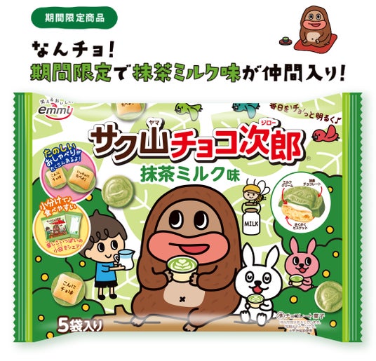 商品ラインナップに期間限定で『5パック サク山チョコ次郎 抹茶ミルク味』が仲間入りします。抹茶ミルク味は昨年待望の新味として登場し、お客様から大好評をいただいており、今年も発売が決定いたしました。