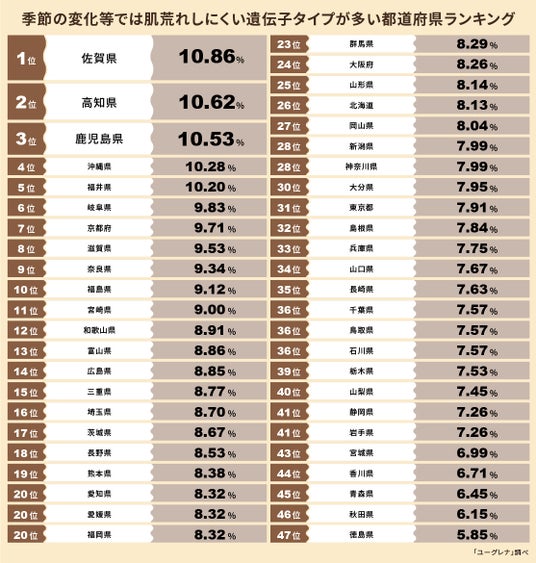 上記の解析結果より、季節の変化等では肌荒れしにくい遺伝子タイプの人の割合が相対的に高い都道府県は、1位 佐賀県、2位 高知県、3位 鹿児島県、4位 沖縄県、5位 福井県、6位 岐阜県、7位 京都府、8位 滋賀県、9位 奈良県、10位 福島県となりました。一方で、ランキング下位(41位以下)には、青森県や秋田県など東北地方の県が含まれる結果となりました。全都道府県ランキングは次の通りです。