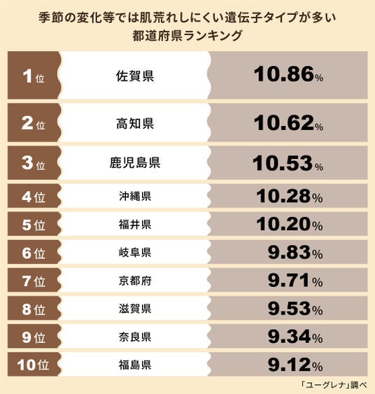 株式会社ユーグレナ(本社:東京都港区、代表取締役社長:出雲充)は、ユーグレナ・マイヘルスとジーンクエストの遺伝子解析サービスのゲノムデータをもとにした「季節の変化等では肌荒れしにくい遺伝子タイプが多い都道府県※1ランキング」を公開します。