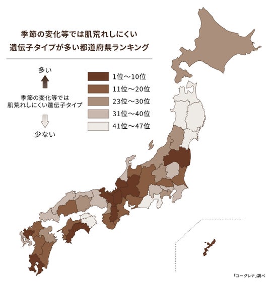 今回の調査では、「季節の変化等では肌荒れしにくいタイプ(遺伝子型:TT)」に該当する人の割合を都道府県(出生地)別に算出し、数値化しました。