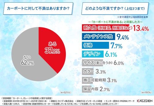 「カーポートに対して不満はありますか?」と質問したところ、『ある(37.8%)』『ない(62.2%)』という回答結果になりました。