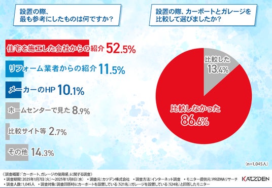 「設置の際、カーポートとガレージを比較して選びましたか?」と質問したところ、8割以上が『比較しなかった(86.6%)』と回答し、『比較した(13.4%)』と回答した方は少数でした。