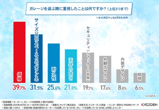 ガレージ選びでも価格が最優先されているものの、空間の広さや耐久性も重視する傾向があるようです。