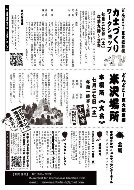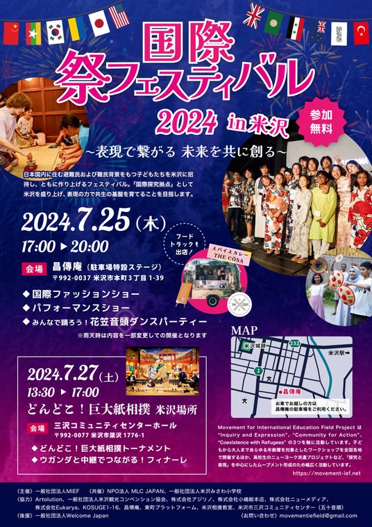 ■協力:Artolution、一般社団法人米沢観光コンベンション協会、株式会社アジリノ、株式会社小嶋総本店、株式会社ニューメディア、株式会社Eukarya、KOSUGE1-16、昌傅庵、東町プラットフォーム、米沢相撲協会、米沢市三沢コミュニティセンター(五十音順)■ MIEF (Movement for International Education Field)の活動について