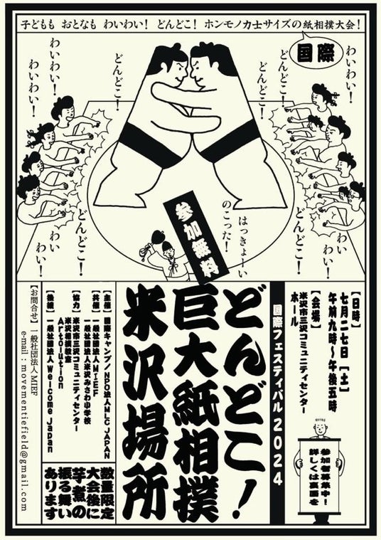 本フェスティバルでは、地元米沢の方々をはじめ、同学校跡地で一ヶ月間滞在する「国際キャンプ」(NPO法人MLC JAPAN主催)参加者、アートを通じた難民の社会包摂を世界各地で展開するNPO団体などとも連携し、さまざまなコラボレーションを展開します。一般公開イベントとして、25日(木)に米沢市内のお寺および地域づくり拠点にて国際ファッションショーを、27日(土)には小学校跡地に隣接するコミュニティセンターにて「どんどこ!巨大紙相撲大会 米沢場所」を開催します。