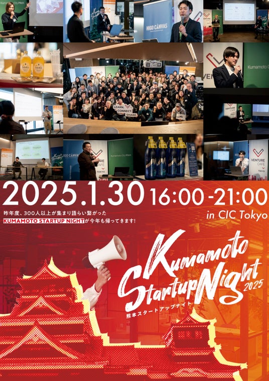 株式会社しびっくぱわー(本社:茨城県つくば市、代表取締役社長:堀下 恭平)は、主催の熊本市(所在地:熊本県熊本市)、共催のVenture Cafe Tokyo(所在地:東京都港区)とともに『KUMAMOTO STARTUP NIGHT 2025』を1/30(木)16:00から東京虎ノ門のCIC Tokyoにて開催します。