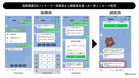 大津市は、大津市LINE公式アカウントとBot Expressが開発提供する「GovTech Express」を連携し、LINE上で、調査員の募集や、指導員や調査員との連絡、調査票回収会場の予約、報酬明細の配布、よくある質問へのチャットボット回答などができる「国勢調査DXパッケージ」を考案しました。