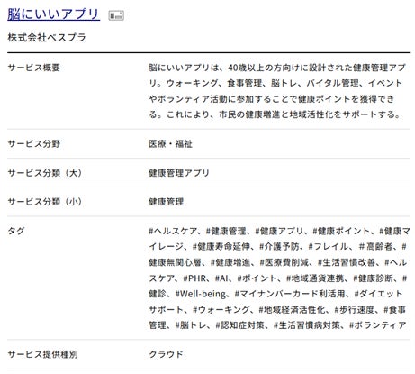 株式会社ベスプラ(本社:東京都渋谷区、代表取締役社長:遠山陽介)は、当社が提供するヘルスケアアプリ「脳にいいアプリ」が、デジタル庁の『デジタル地方創生サービスカタログ(2024年冬版)』に掲載されたことをお知らせします。2024年夏版に引き続き、同年冬版にも掲載となりました。