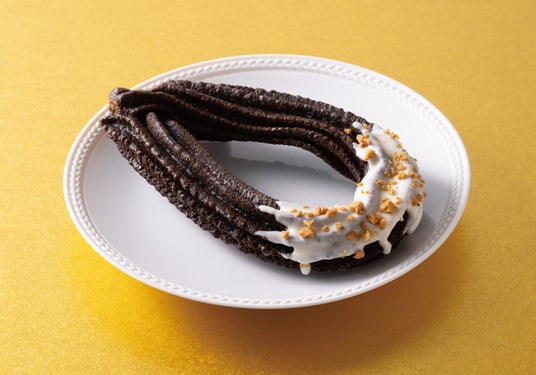 ブラックココアを使用したチョコ味のチュロッキーにホワイトチョコをかけ、アーモンドクランチをトッピングしました。