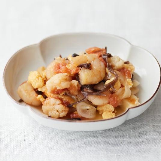 海老と卵の中華炒めきざみ生姜を炒めた自家製の餡かけで、からだの芯からぽかぽかになる一品です。