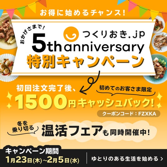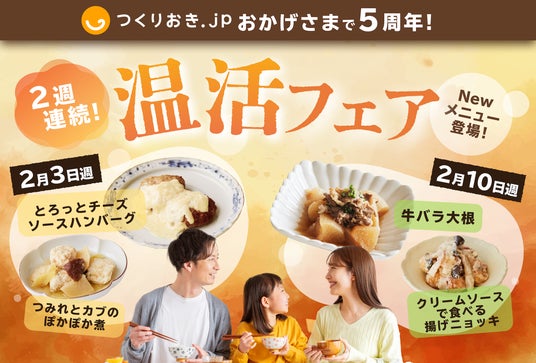 手作りおかずの宅配サービス「つくりおき.jp」を運営する株式会社Antway(所在地:東京都千代田区、代表取締役社長CEO:前島 恵)は、2025年2月にサービス開始5周年を迎えます。5周年の感謝の気持ちを込めて、2025年2月3日(月)から2月16日(日)の2週間に渡り、「冬を乗り切る温活フェア」を開催いたします。牛バラ大根や、クリームソースで味わうニョッキなど、心も身体も温まるようなメニューの提供を予定しています。さらに、初めて注文される方を対象に1,500円のキャッシュバックキャンペーンを同時開催いたします。
