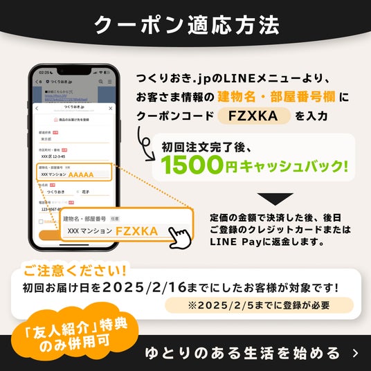 - 対象者:つくりおき.jpを初めてご利用されるお客様