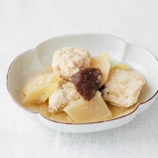 つみれとカブのぽかぽか煮生姜の入っただし汁で、季節のカブとふんわりしたつくねを煮込みました。体の芯から温まる冬の煮物です。