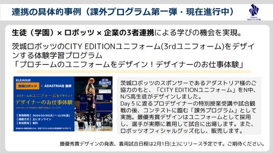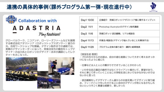「茨城ロボッツ」を題材にした学習コンテンツの企画・提供、および、スポーツビジネスに関する講座の実施。