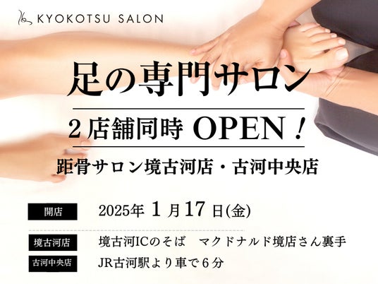 SNSで話題の足の専門サロン「距骨サロン」が、全国91・92店舗目となる「距骨サロン古河中央店」と「距骨サロン境古河店」を2025年1月17日(金)に2店舗同時OPENいたします。