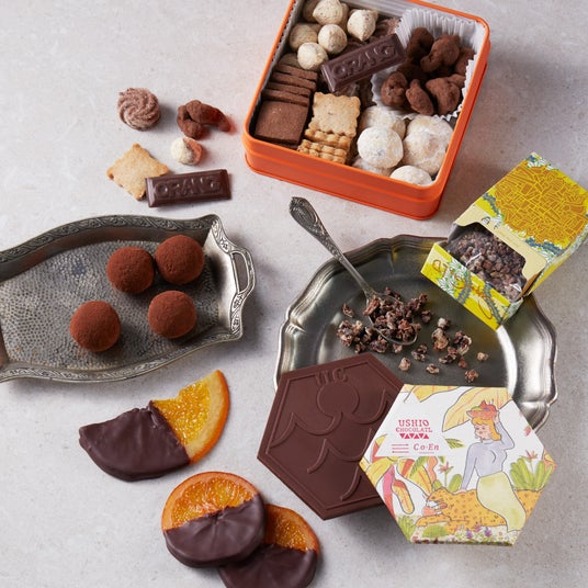 上)初登場【オランオランカカオ】オランオランカカオミックスクッキー缶(1缶) 3,024円 左)初登場【モンプチ ヴィア カカオ】モンプチのスパイストリュフ(4個入) 1,836円 下)初登場【オランジュエル】スマトラ島euki農園オランジェット(4枚入) 3,150円 右)【ウシオチョコラトル】USHIOギフトボックス(1箱) 4,050円