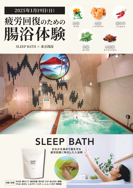イベントは、「疲労回復のための、腸浴体験」と題して、各店の湯船の一つを、入浴に適した40度程度の“ぬるま湯”に設定し、当社新商品「SLEEP BATH(スリープバス)」を使用した入浴をしていただけます。 新商品は、疲労回復効果のある医薬部外品で、ぬるめのお湯でも体を芯から温めることができるように生薬をオリジナル処方で配合しています。その独自の生薬ブレンドの力を今回、銭湯で体感していただけます。