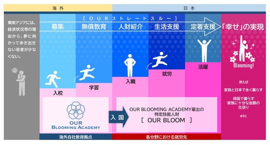 アジア各国における人財教育と、特定技能に特化した日本国内への人財紹介事業を展開※。2024年11月30日現在、累計教育人数7,395名(自社海外アカデミー在学及び終了した累計人数)、特定技能試験の合格者を5,643名輩出しております。特定技能人財の職業紹介においては5,550名が内定、4,283名(累計)がすでに紹介先で就業を開始しております。海外現地の自社教育拠点である「OUR BLOOMING ACADEMY」における日本語および特定技能教育から人材紹介、就業後の生活や資格取得の支援までをワンストップで行う独自スキーム「OURストレートスルー」により、安定して長く働ける人財をご紹介しております。