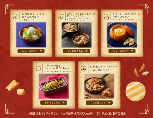 本キャンペーン特設サイト内では、『ダンジョン飯』に登場する料理を三幸製菓の商品を使ってアレンジしたオマージュレシピ集「ダンジョン菓子レシピ」もご紹介しております。本キャンペーンにご応募いただく際の対象商品を使用して再現できるレシピですので、本キャンペーンにご参加いただいた際にぜひご自宅でお試しください。