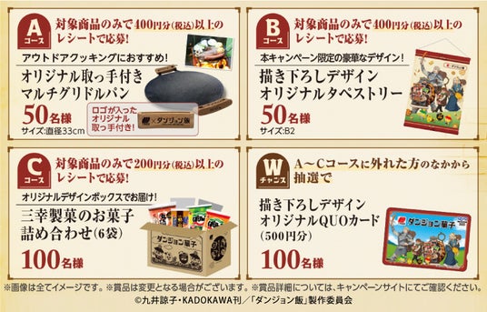 本キャンペーン期間中にキャンペーン対象商品を指定金額分(税込)以上お買い上げいただいたレシートを添えてダンジョン菓子キャンペーン特設サイト内のWEBフォームもしくは郵便はがきよりご応募いただくと、抽選で合計300名様に本キャンペーン限定のオリジナルコラボグッズやお菓子の詰め合わせが当たります。