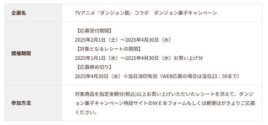 三幸製菓株式会社(所在地:新潟市北区)は、TVアニメ『ダンジョン飯』とのコラボキャンペーン、「ダンジョン菓子キャンペーン」を2025年2月1日(土)より開催いたします。