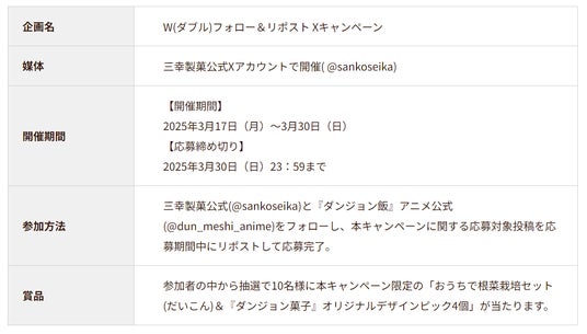 対象商品の購入レシートでご応募できる「ダンジョン菓子キャンペーン」の開催に合わせて、三幸製菓公式X(旧:Twitter)でもTVアニメ『ダンジョン飯』とのコラボキャンペーンを開催いたします。三幸製菓公式X(@sankoseika)と『ダンジョン飯』アニメ公式(@dun_meshi_anime)の2アカウントをフォローし、本キャンペーンに関する応募対象投稿を応募期間中にリポストしてご応募いただけます。企画詳細については、本キャンペーン特設サイト内「Wフォロー&リポストXキャンペーン」、または三幸製菓公式Xアカウントの投稿をご確認ください。