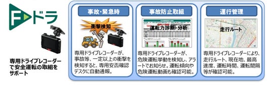 『F-ドラ』は専用ドライブレコーダーで、企業・従業員の「事故・緊急時」「事故防止取組」「運行管理」の3つをサポートする三井住友海上のフリート契約者向け有償サービスです。